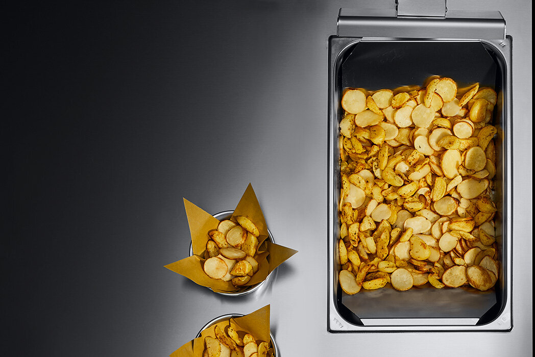 Lo scaldapatate Roc 900 completa l'opera della friggitrice mantenendo croccanti patate, pesce, verdure e carne appena fritte.